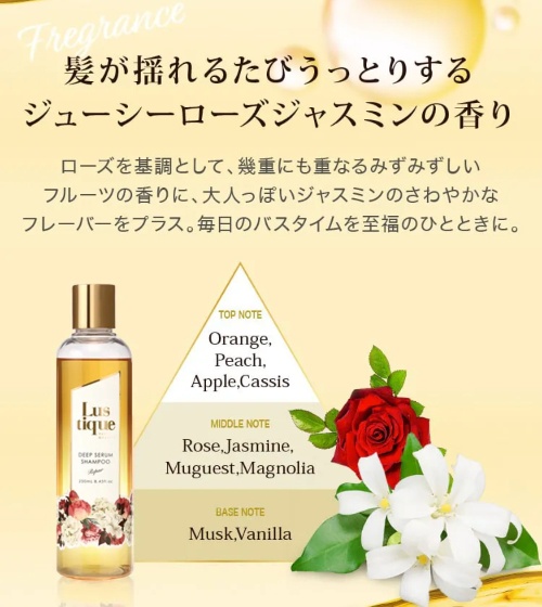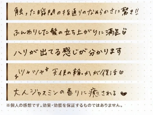 女性らしいフローラルな香りと、すっきりとした甘さのジャスミンの香りなどなど、髪の毛が揺れるたびにふんわりと香ってくれます。香りに持続性があるのも嬉しいですね。