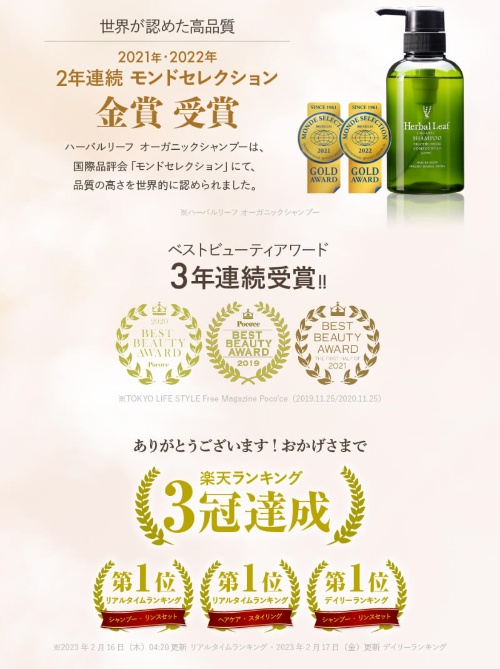 優しいヘアケア商品を使いたい、髪の毛や頭皮に潤いを与えたい、香りが良くてリラックスできるシャンプー・コンディショナーが好み、という方にはハーバルリーフはイチオシです♪